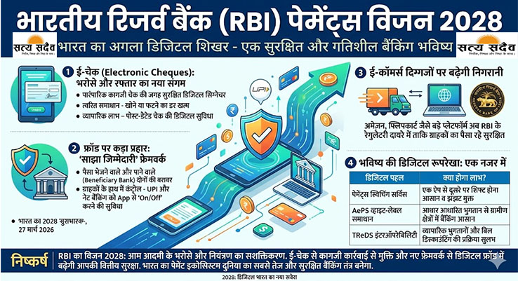 मुंबई | विशेष संवाददाता भारतीय रिजर्व बैंक (RBI) ने देश को 'डिजिटल इंडिया' के अगले शिखर पर ले जाने के लिए अपना महत्वाकांक्षी 'पेमेंट्स विजन 2028' दस्तावेज जारी कर दिया है। 27 मार्च 2026 को पेश किए गए इस विजन का सबसे क्रांतिकारी हिस्सा 'ई-चेक' (Electronic Cheques) की शुरुआत है। यह कदम न केवल सदियों पुरानी कागजी चेक परंपरा को डिजिटल युग में ले जाएगा, बल्कि बैंकिंग सुरक्षा के मानकों को भी पूरी तरह बदल देगा।