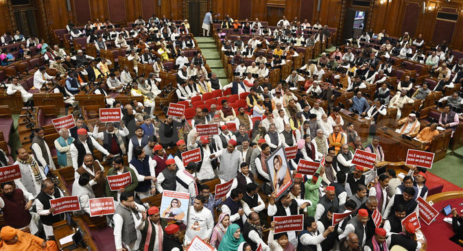 : उत्तर प्रदेश विधानसभा का बजट सत्र बुधवार को उस समय अखाड़े में तब्दील हो गया, जब मत्स्य मंत्री डॉ. संजय निषाद के भाषण के दौरान सत्तापक्ष और विपक्ष के बीच जबरदस्त टकराव देखने को मिला। मामला इतना बढ़ गया कि समाजवादी पार्टी (सपा) के विधायक वेल तक आ गए, नारेबाजी की और मंत्री के हाथ से उनके भाषण की प्रतियां छीनने का प्रयास किया।