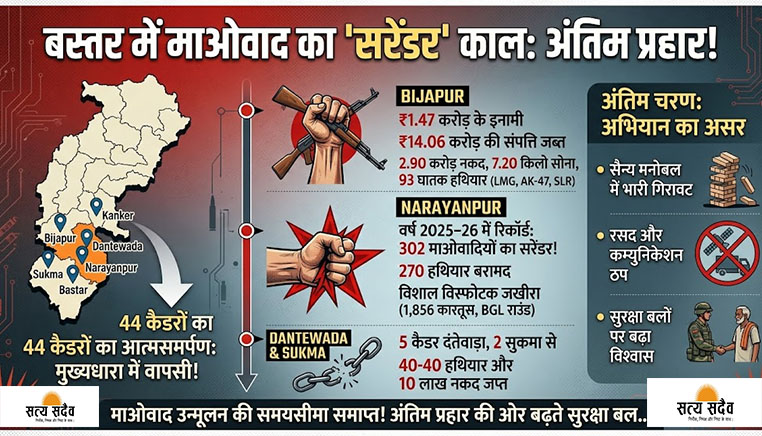 पुलिस आंकड़ों के अनुसार, नारायणपुर जिले में अकेले वर्ष 2025–26 के दौरान अब तक 302 माओवादी कैडर आत्मसमर्पण कर चुके हैं और 270 हथियार बरामद किए गए हैं।